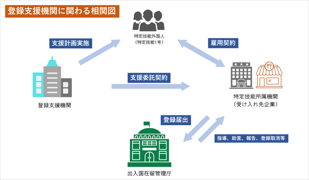 受け入れ先である特定技能所属機関は、1号特定技能外国人が「特定技能」の在留資格に基づく活動を安定的かつ円滑に行うことができるようにするための職業生活上、日常生活上又は社会生活上の支援の実施に関する計画(1号特定技能外国人支援計画)の作成と支援を行わなければなりません。 登録支援機関は、特定技能所属機関から委託を受ける形で1号特定技能外国人の「支援」と「支援計画の作成の補助」を行うことができる機関です。